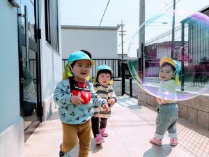 フワフワとんでくるシャボン玉に夢中の子どもたち