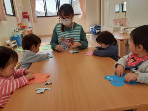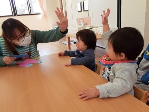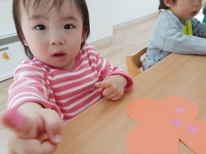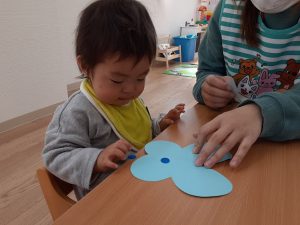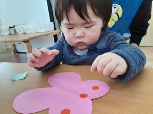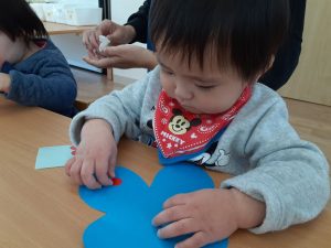 シールが指にくっつくのが気になる子、シールが貼れる面白さに気づいて夢中になって遊んでいる子