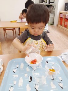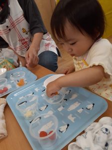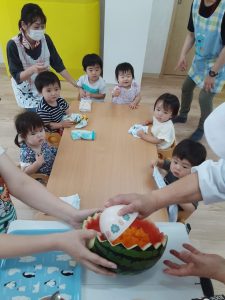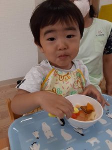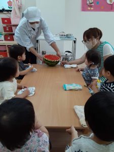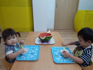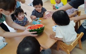 調理員さんがスイカポンチを作ってくれる姿を目の前で見た経験から、1歳児の子どもたちも自分なりに考え、フルーツを混ぜることにすぐに気が付き先生と一緒に楽しんでいました。