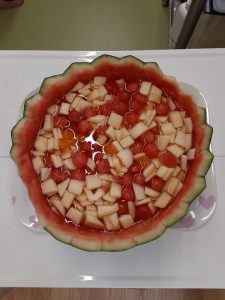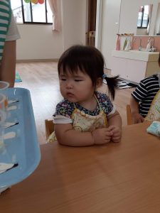 今日のスイカポンチ作りにやる気一杯の子どもたちですね