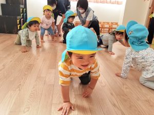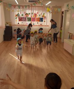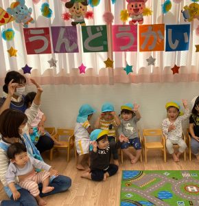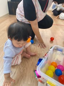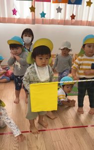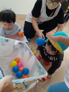 まずは0歳児のふたば組のお友達から玉入れしますよ