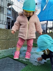 氷の上を歩くとザクザク音が鳴ることも発見した子どもたち。