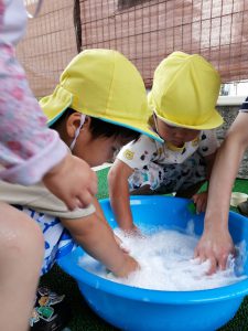 皆で水をかき混ぜ泡を作って遊んだり、室内ではスライム作りも行いました!