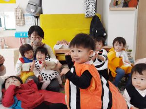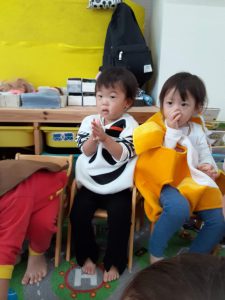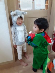 と可愛らしい仮装姿のお子様が次々とやってきました。友達の仮装を見て、「かわいいね!」と