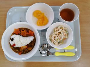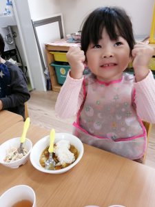 お腹がペコペコで園に戻ると、調理員さんがおばけのカレーを作って待っていてくれました。