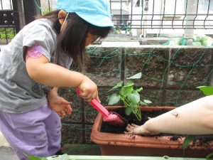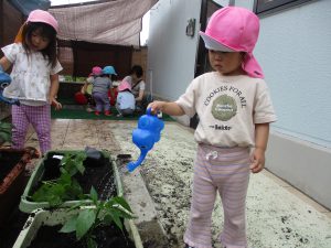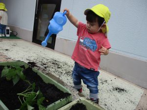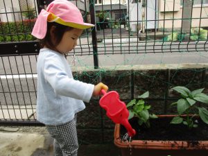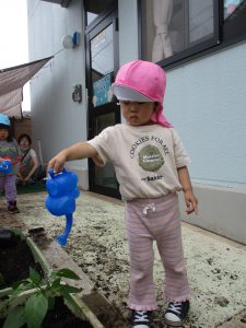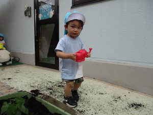 水がこぼれないようにじょうろを両手でそ~っと持って・・・ジャ~