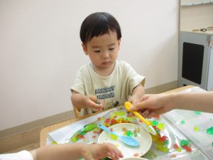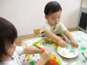 感触遊びを通して色の違いや指先の感覚が楽しめたり、