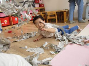 たいようぐみのお友だちの新聞紙遊びをみて、そらぐみさんも・・・