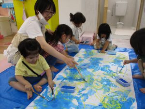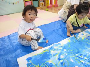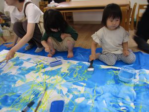 大きな紙にお絵描きした上から筆を使って絵の具遊びしてみたり、、、