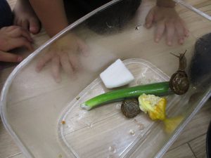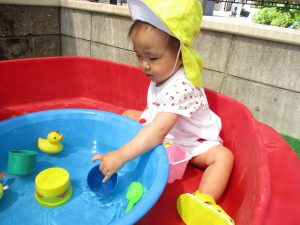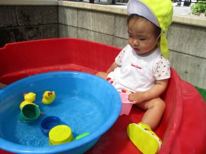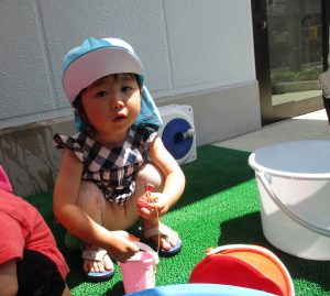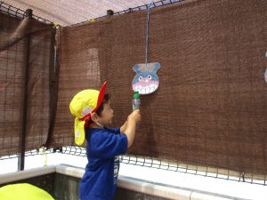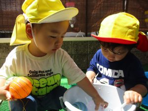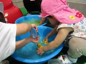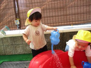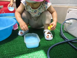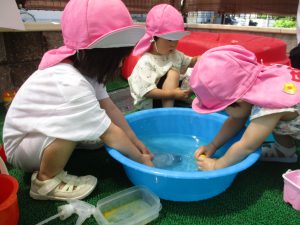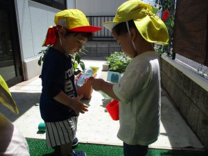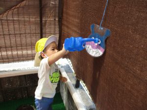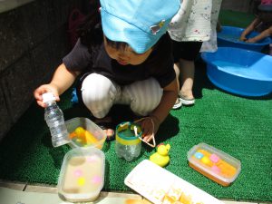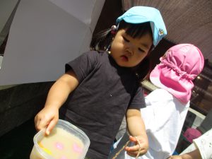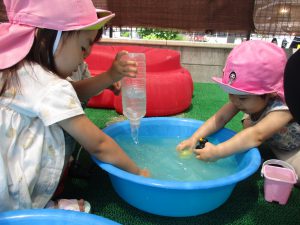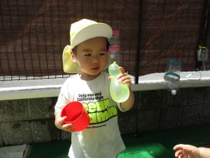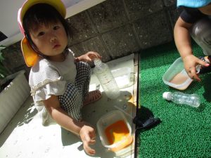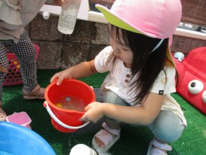 容器を使って的あてをしたり、水をかけてあげたりする中で、