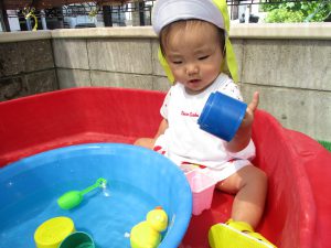 先生たちと一緒に水に触れて楽しんでいますよ。