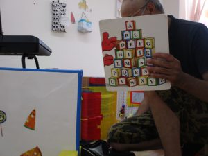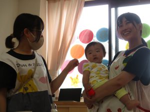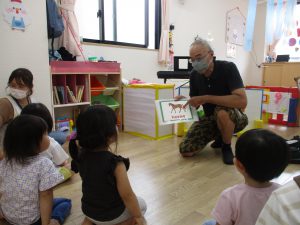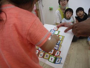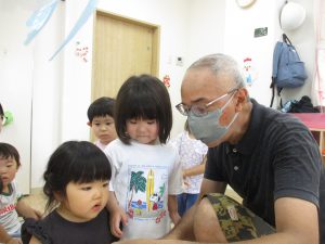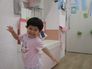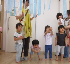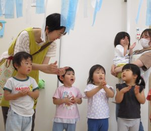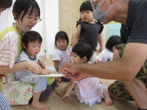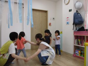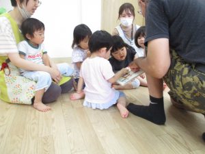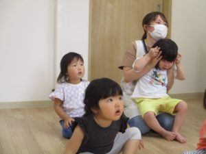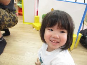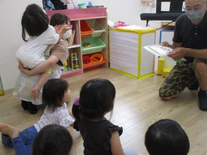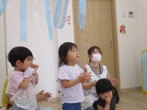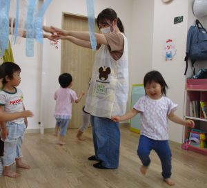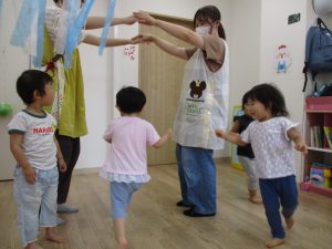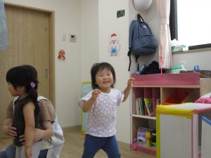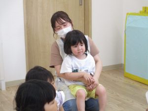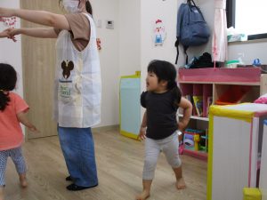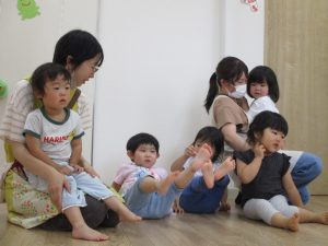 歌とリズムに合わせて手をたたいたり足をブラブラさせたり、歌の真似っこで盛り上がります。