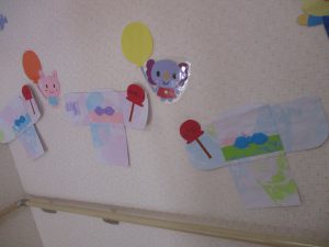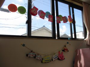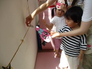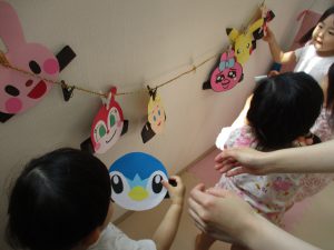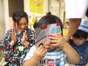 嬉しそうに洗たくばさみから外してお面を受け取りました。