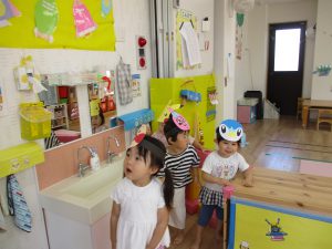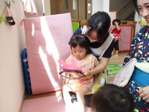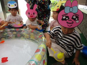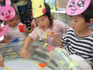 金魚すくいやさんでは・・・先生の見本をみたあとに挑戦!