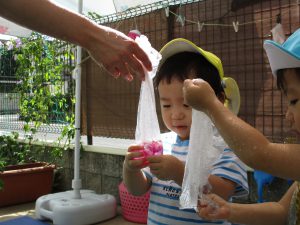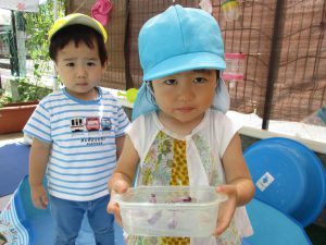 そのアサガオを拾い集めて、、、色水遊びに使いました。