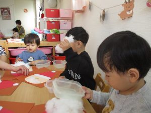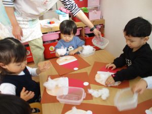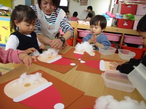サンタさんの顔に何やら綿をペタペタ。どんな仕上がりになるのでしょう・・・