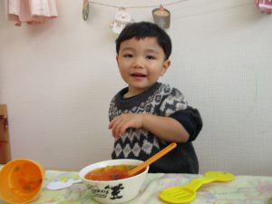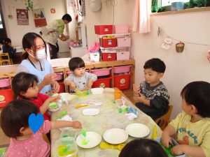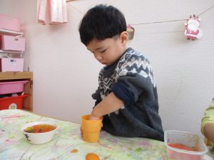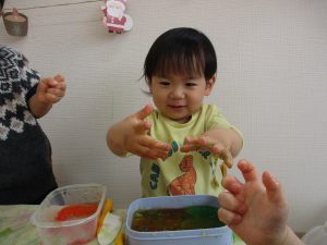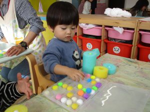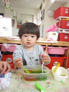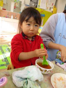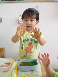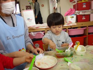 これはね、片栗粉スライムっていうんだよ。まえもやったことある~!たのしいのだよね~!