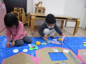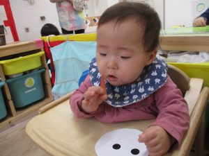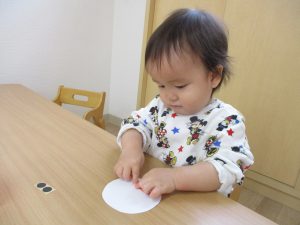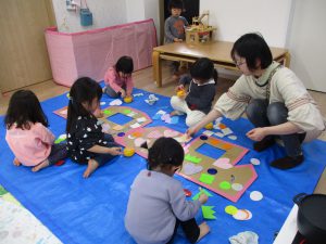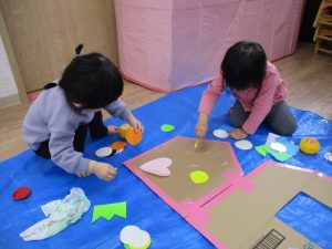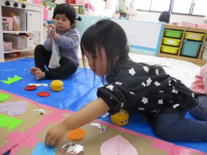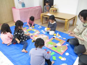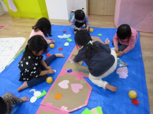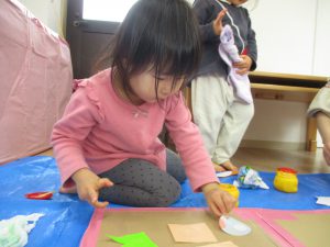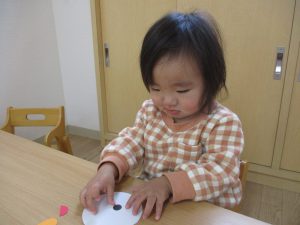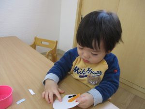 指に糊をつけて上手に貼りつけているのは、たいようぐみのお友だち。
