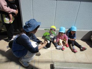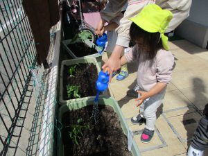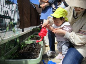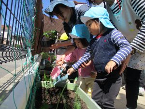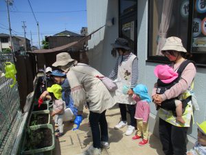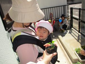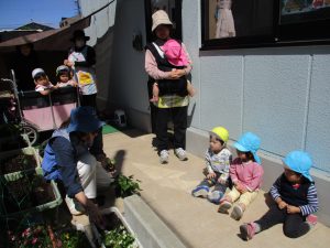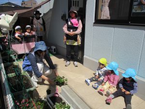 「今からみんなで植えようね~」 「はじめに先生がやるから見ていてね」