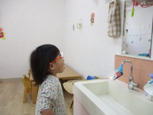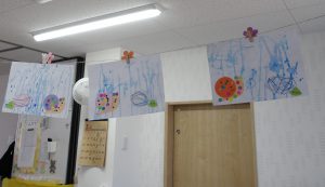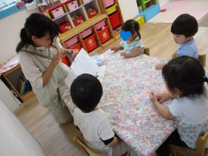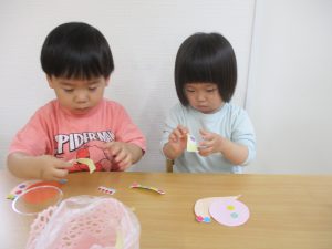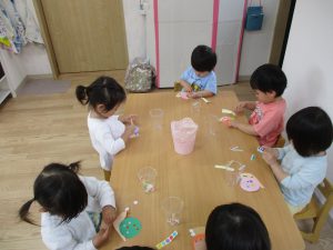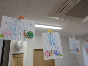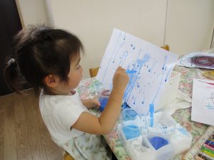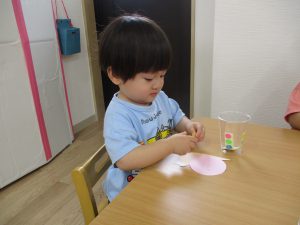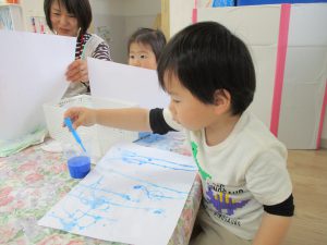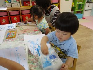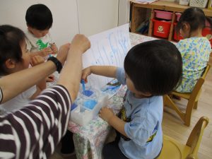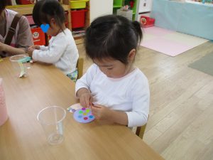 先日、たいようぐみ(2歳児)さんはスポイトを使って垂らし絵あそびをしました。