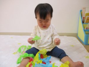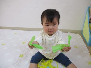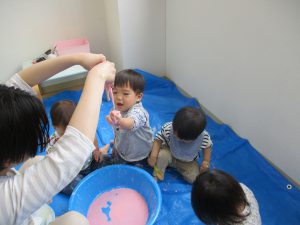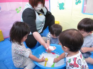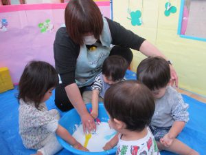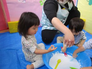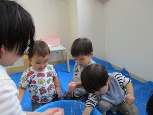 となりのそらぐみ(1歳児)さんは、水を入れて片栗粉をムニュムニュ!!!