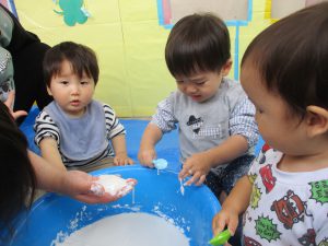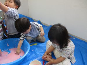 手で触ってみる子やスプーンですくう子、遊び方はそれぞれでしたが