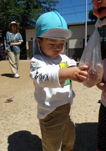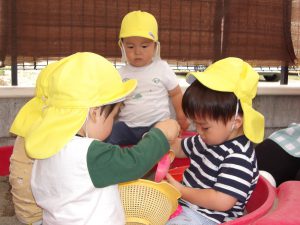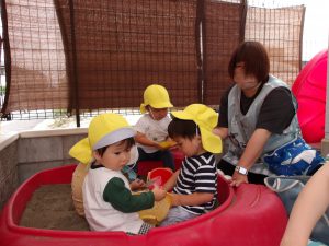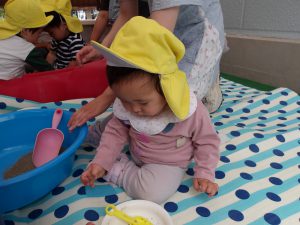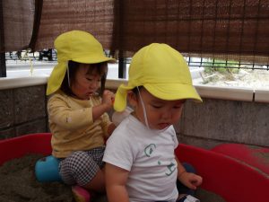 砂場では、砂を容器へ移し替えることを繰り返し楽しんでいました。