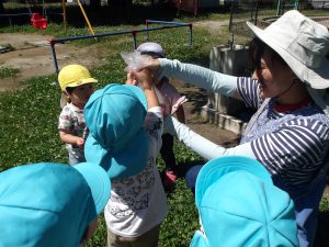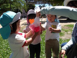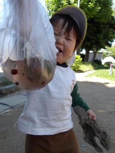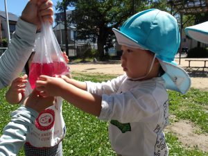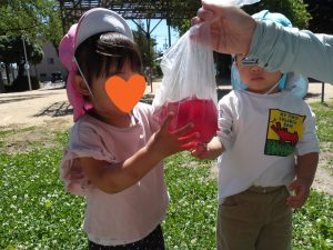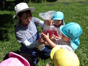 先生と一緒に、袋の中に木の実と水を入れてみました。