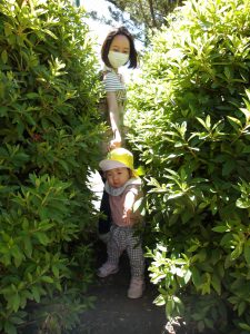 植込みの隙間を通ることが楽しくて行ったり来たり。「えへへ」