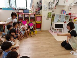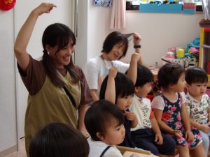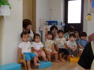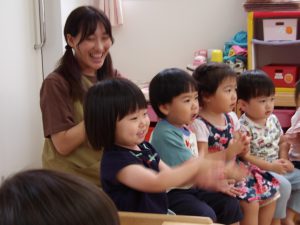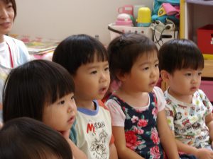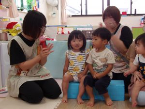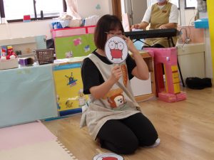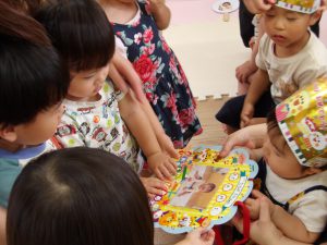 今月の先生からの出し物は、みんなが大好きな「だるまさん」シリーズのペープサート!!