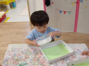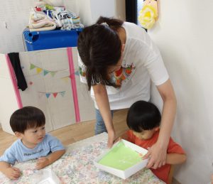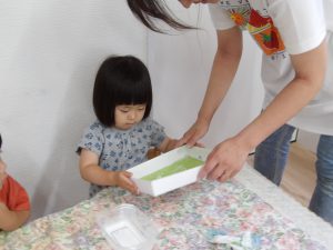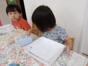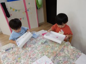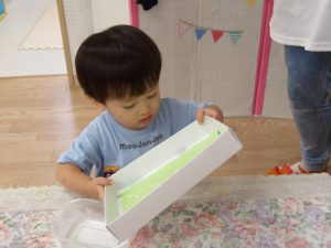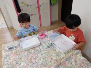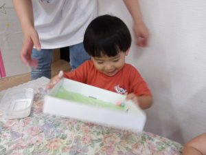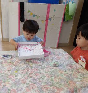 今日は空き箱とビー玉、絵の具を使って