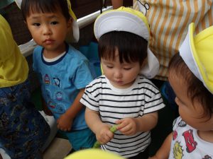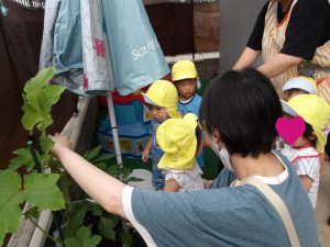 今回はそらぐみ(1歳児)さんが、オクラの収穫を行いました。