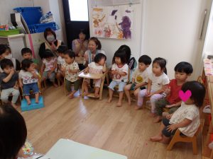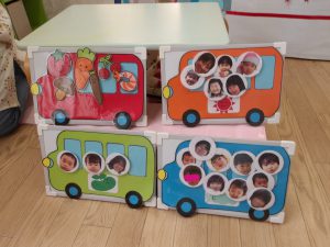 歌に合わせて、お友だち(自分たち)が次々にバスに乗りこむ様子を、