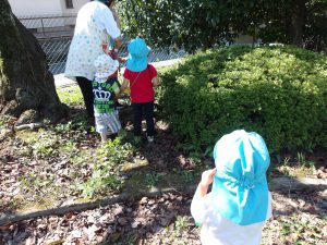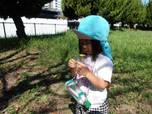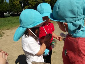 (何匹もつかまえたバッタたちは、保育所のプランターに逃がしてあげました)