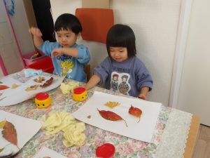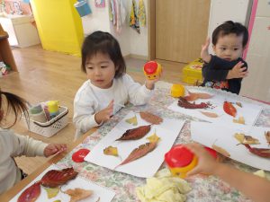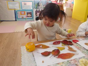 見つけたカラフルな落ち葉を持ち帰って、貼りつけてみたら・・・