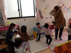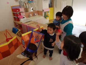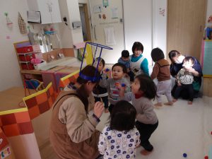 たいようぐみ(2歳児)のお友だちが、ふたばぐみ(0歳児)の部屋へ