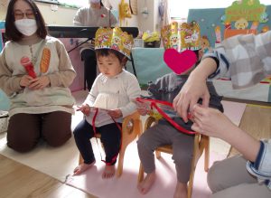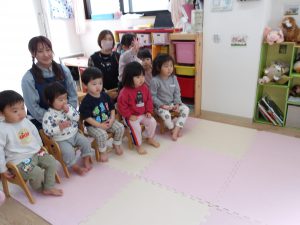 ピアノに合わせて「むすんでひらいて」「バスごっこ」の曲で触れ合いを楽しみました。