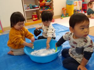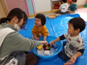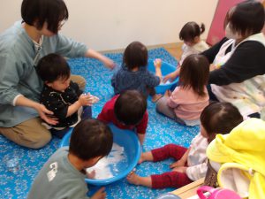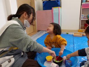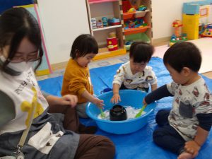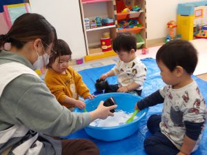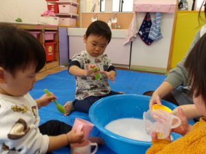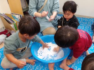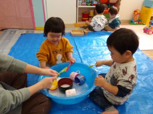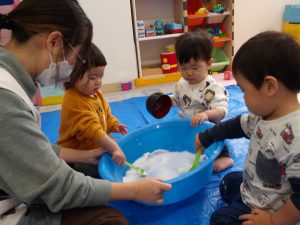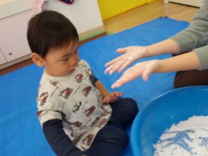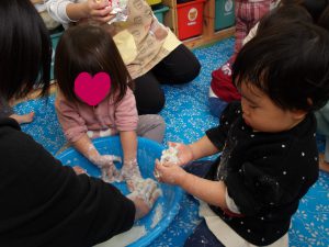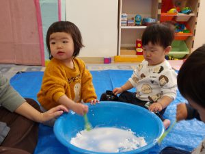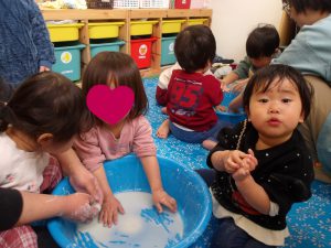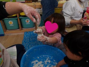 水加減次第で感触の違いを楽しめる片栗粉粘土遊び。✨✨