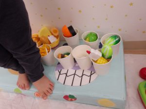 おままごとの食べ物を丁寧に詰めて、ビュッフェコーナーが完成していました。
