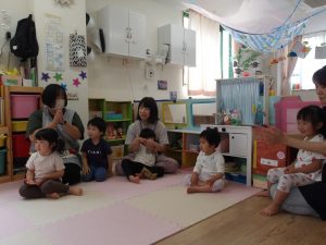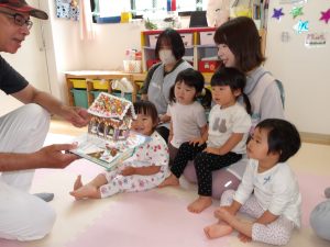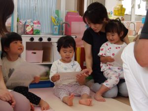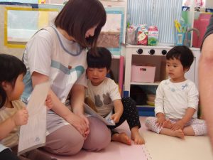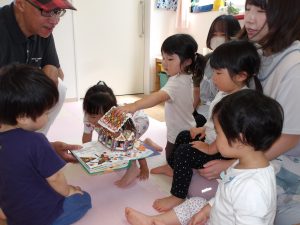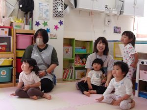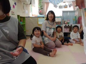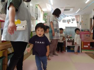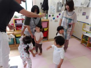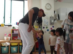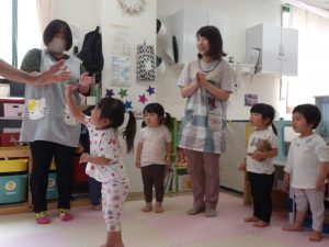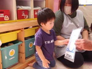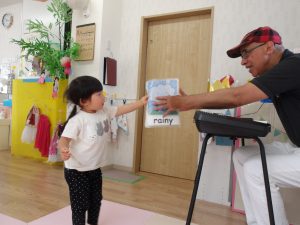 絵カードにあったものを、リズムに合わせてウォーレン先生に渡しに行ったり、