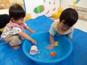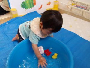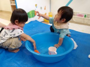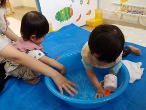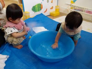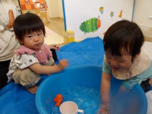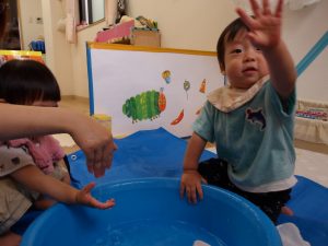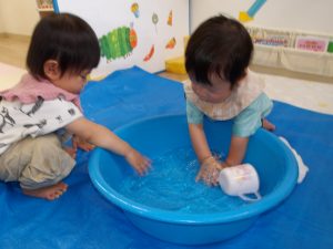 フィリオ便り 初めての水遊び。【ふたばぐみ】 2025年6月16日 先生がね。 たらいに水を用意してくれたよ。 わぁ~い ちゃぷちゃぷ。 先生の手からもポタポタポタ~ まぜまぜぐるぐる~ 保育所での初めての水遊び。 バシャバシャしながら、気持ちよさそうに水に触れて楽しみました。 これからい~っぱい、水遊び楽しもうね~😊