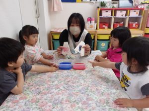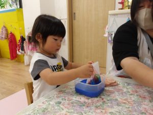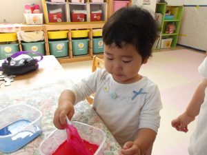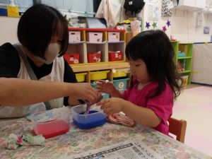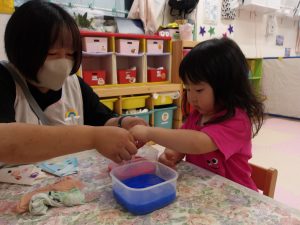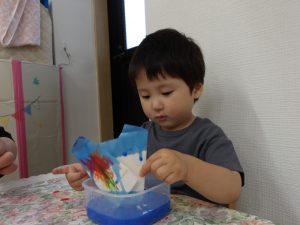 先生と一緒に服に色をつけて染み込ませていって・・・