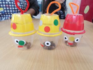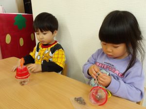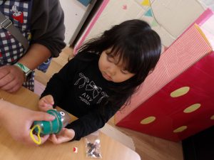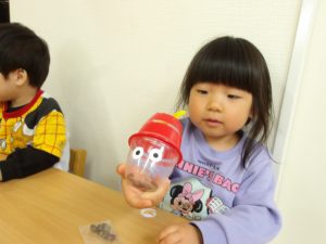 容器の中にどんぐりを入れて、その上からシールをペタペタ。