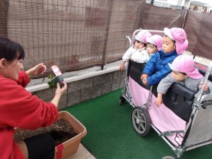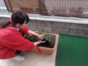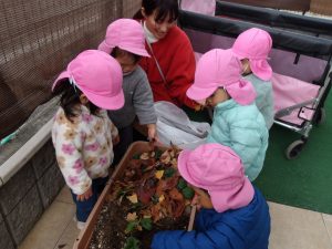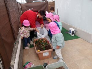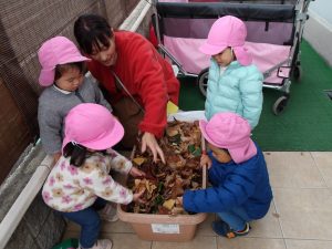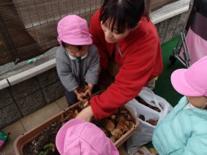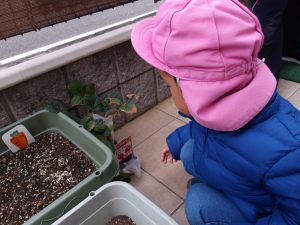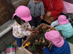 フィリオ便り 🍓いちごちゃんに会えますように。【そらぐみ】 2025年12月5日 おいもの次は・・・ いちごを育てることにしました。🍓 先生に植えてもらって・・・ みんなで集めて持ち帰った落ち葉を、 お布団代わりに苗の上にパラパラ~。🍂🍃 春になったら美味しいいちごに会えますように。🍓