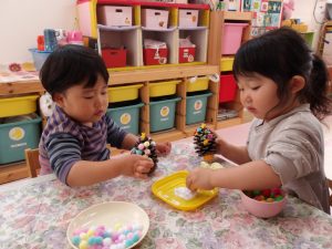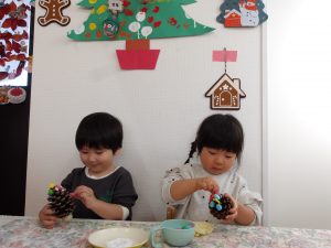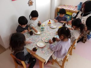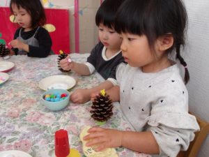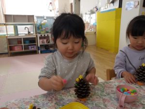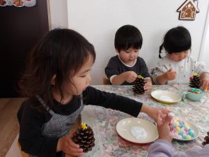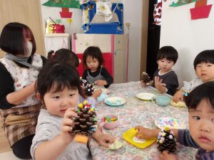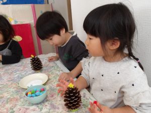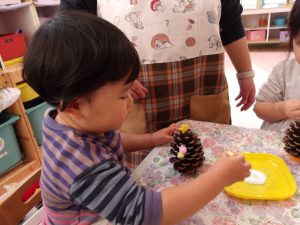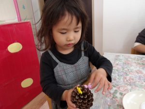 今日は松ぼっくりを使ってクリスマスツリーづくり。🎄
