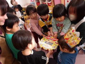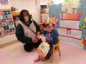 冠をかぶせてもらい、お友だちからプレゼントを受け取った後は、