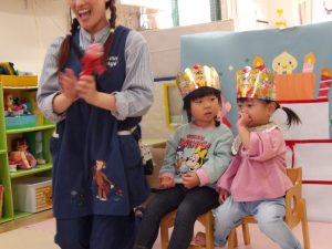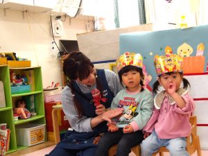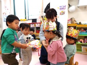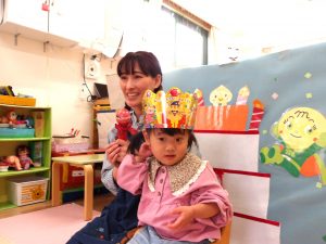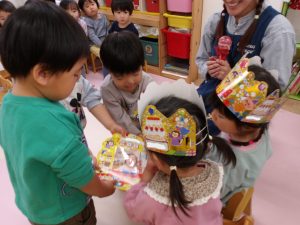 先生から冠を被せてもらい、お友だちからプレゼントを渡してもらって、