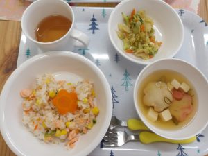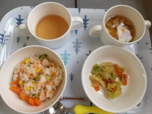 今日の給食はちらし寿司、春野菜のおかか和え、花麩のすまし汁。✨✨